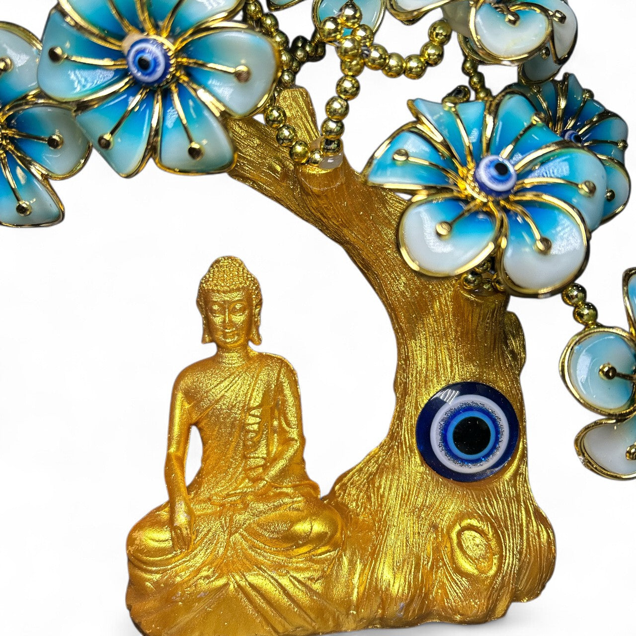 Enhance your environment with the Golden Buddha Evil Eye Tree, a finely crafted spiritual showpiece that combines protective charm and positive energy. This elegant golden Buddha idol represents peace, harmony, and enlightenment, seated beneath a decorative Feng Shui money tree adorned with vibrant turquoise and white enamel flowers, each featuring powerful Evil Eye charms for protection. Ideal for home decor, office spaces, meditation rooms, or Vastu setups, it promotes prosperity, shields against negative energy, and adds refined beauty. Perfect as a spiritual gift, Vastu enhancer, and Feng Shui lucky charm, this piece brings harmony, protection, and good fortune to any setting.