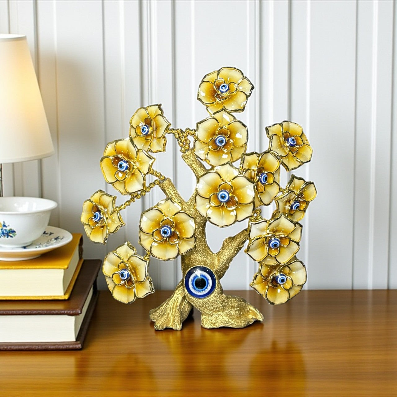 Add an elegant touch of positivity and protection to your space with the Golden Evil Eye Tree. Expertly handcrafted with golden enamel flowers, this decorative Feng Shui tree features embedded blue Evil Eye charms known for shielding against negative energies and attracting good fortune. Ideal for home décor, office desks, spiritual spaces, or meditation corners, it aligns with Feng Shui and Vastu principles to invite prosperity, peace, wealth, and luck. This spiritual showpiece is both a stylish accent and a meaningful symbol, making it perfect for personal use, Vastu remedies, Feng Shui enhancements, or thoughtful gifting.