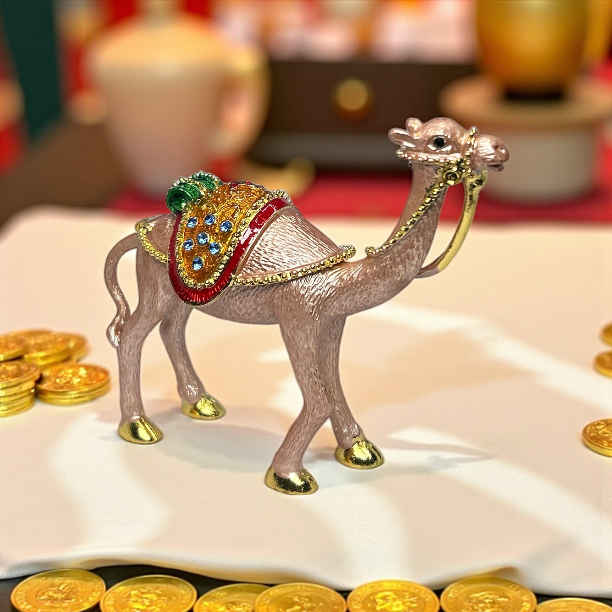 Add a touch of luxury, elegance, and spiritual energy to your space with this Camel Trinket / Jewelry Box, beautifully designed with vibrant enamel, golden accents, and crystal embellishments. This unique decorative box symbolizes endurance, prosperity, and wealth attraction, making it perfect for manifestation and wish fulfillment rituals. Its hidden compartment is ideal for storing jewelry, keepsakes, or personal wishes. A perfect blend of style and symbolism, this exquisite camel figurine enhances positive energy in any home, office, or gifting setting.