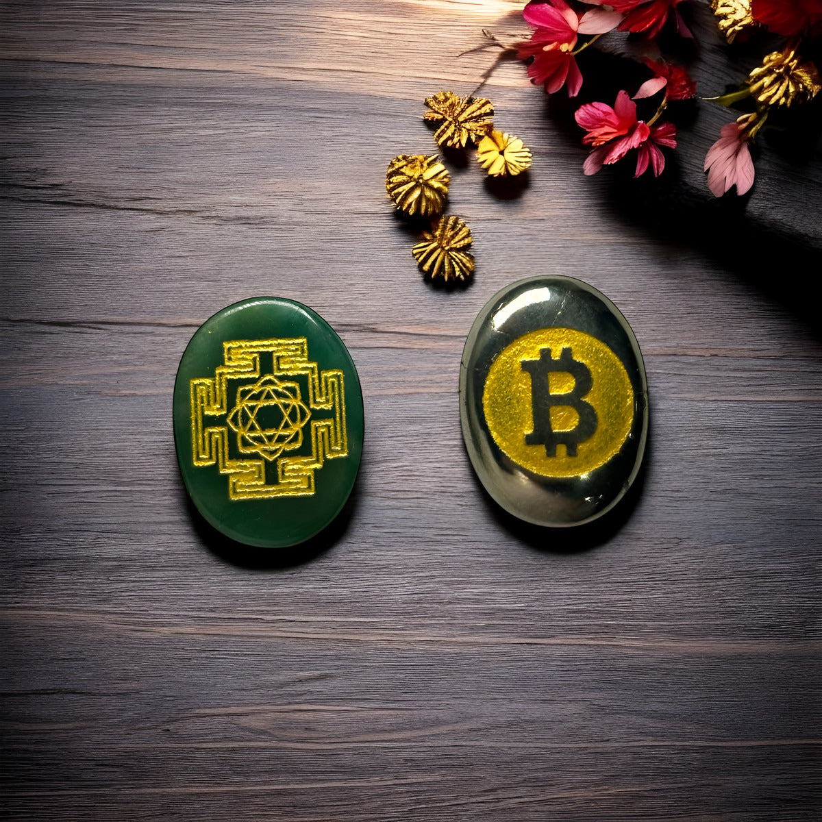 The Mahalaxmi Sri Yantra coin and Pyrite Blessing Coin bring luck and abundance to your life. The intricate design of the Sri Yantra promotes prosperity and success, while the Pyrite coin is believed to attract wealth and good fortune. Perfect for anyone seeking positive energy and blessings.
