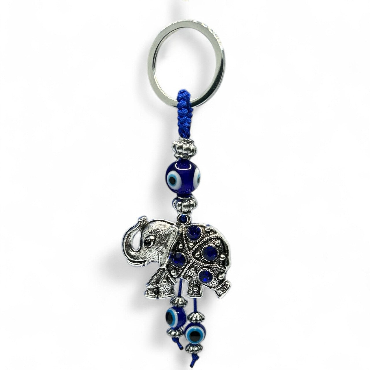 Bring positive energy everywhere you go with this Silver Elephant Evil Eye Keychain. Designed with detailed craftsmanship and vibrant blue beads, this charm symbolizes good luck, strength, and protection against negativity. Perfect as a car keychain, bag charm, or gift, it adds a stylish and spiritual touch to your daily accessories.