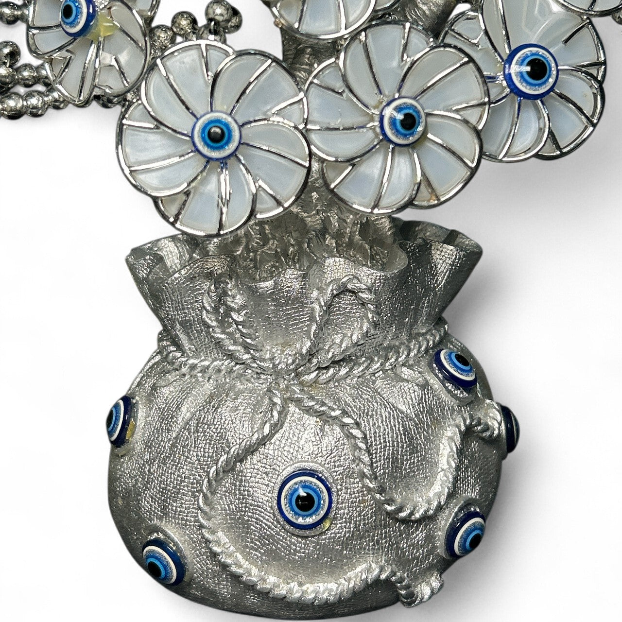 Bring prosperity, protection, and positive energy into your space with this Silver Evil Eye Money Tree. Handcrafted with white floral designs and embedded blue Evil Eye charms, it symbolizes wealth, luck, and spiritual safeguarding. Perfect for home décor, office desks, Feng Shui, and Vastu, this elegant tree is a meaningful accent and a thoughtful gift.
